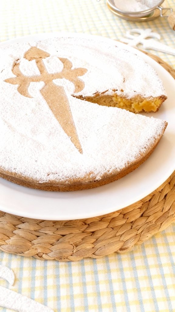 The top gets dusted with powdered sugar through a stencil of the Cross of Saint James, leaving the symbol of the Camino pilgrimage stamped on every slice.